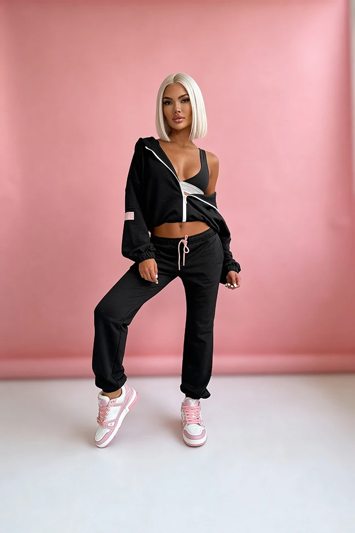 3-częściowy komplet, który łączy wygodę z nowoczesnym stylem. W jego skład wchodzi bluza z zamkiem i kapturem, spodnie z elastyczną talią oraz dopasowany top, tworząc spójną i funkcjonalną całość. Idealny wybór na co dzień – zapewnia komfort noszenia, swobodę ruchów i modny wygląd bez wysiłku.