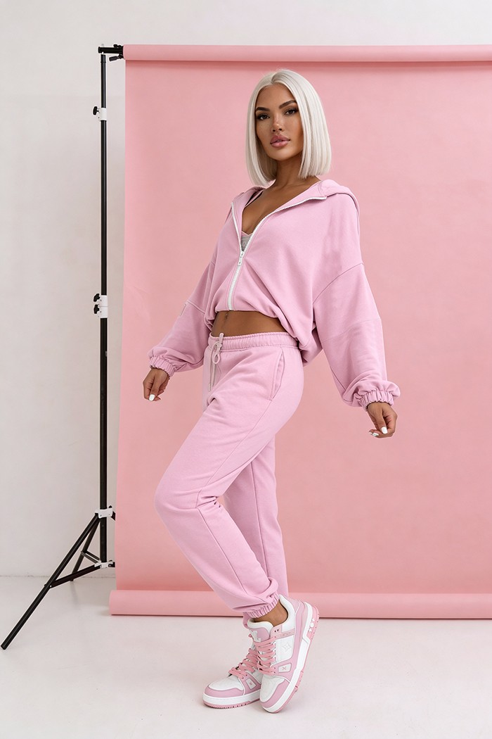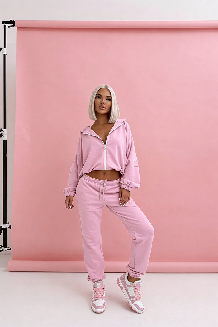 3-częściowy komplet, który łączy wygodę z nowoczesnym stylem. W jego skład wchodzi bluza z zamkiem i kapturem, spodnie z elastyczną talią oraz dopasowany top, tworząc spójną i funkcjonalną całość. Idealny wybór na co dzień – zapewnia komfort noszenia, swobodę ruchów i modny wygląd bez wysiłku.